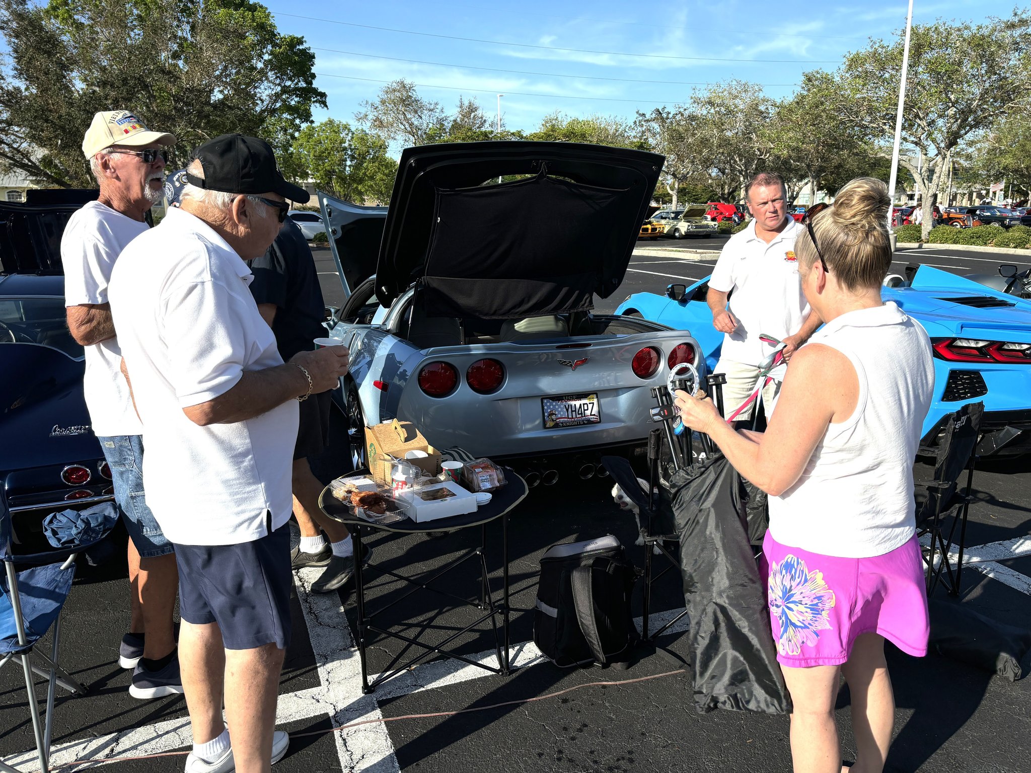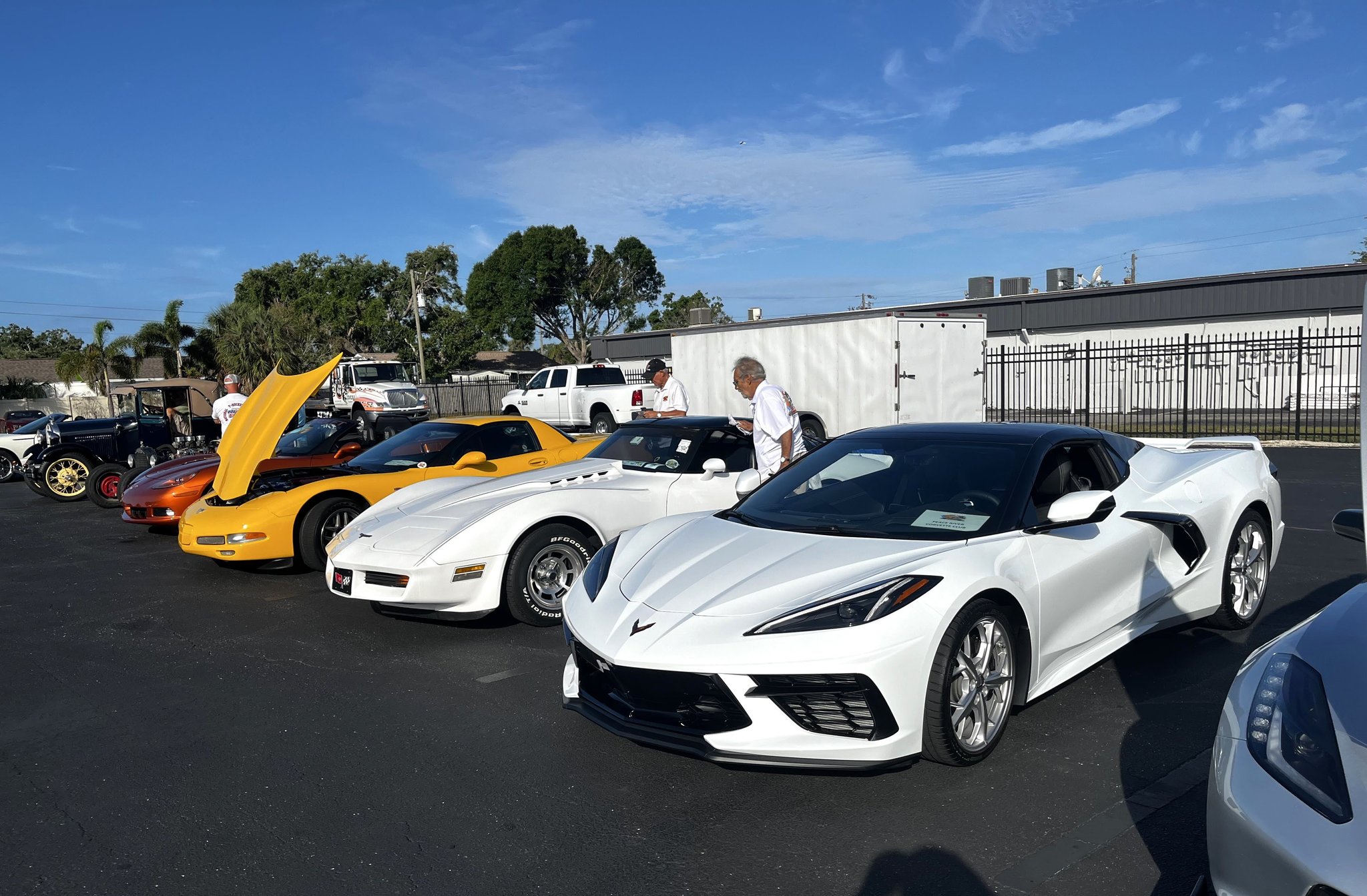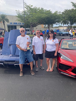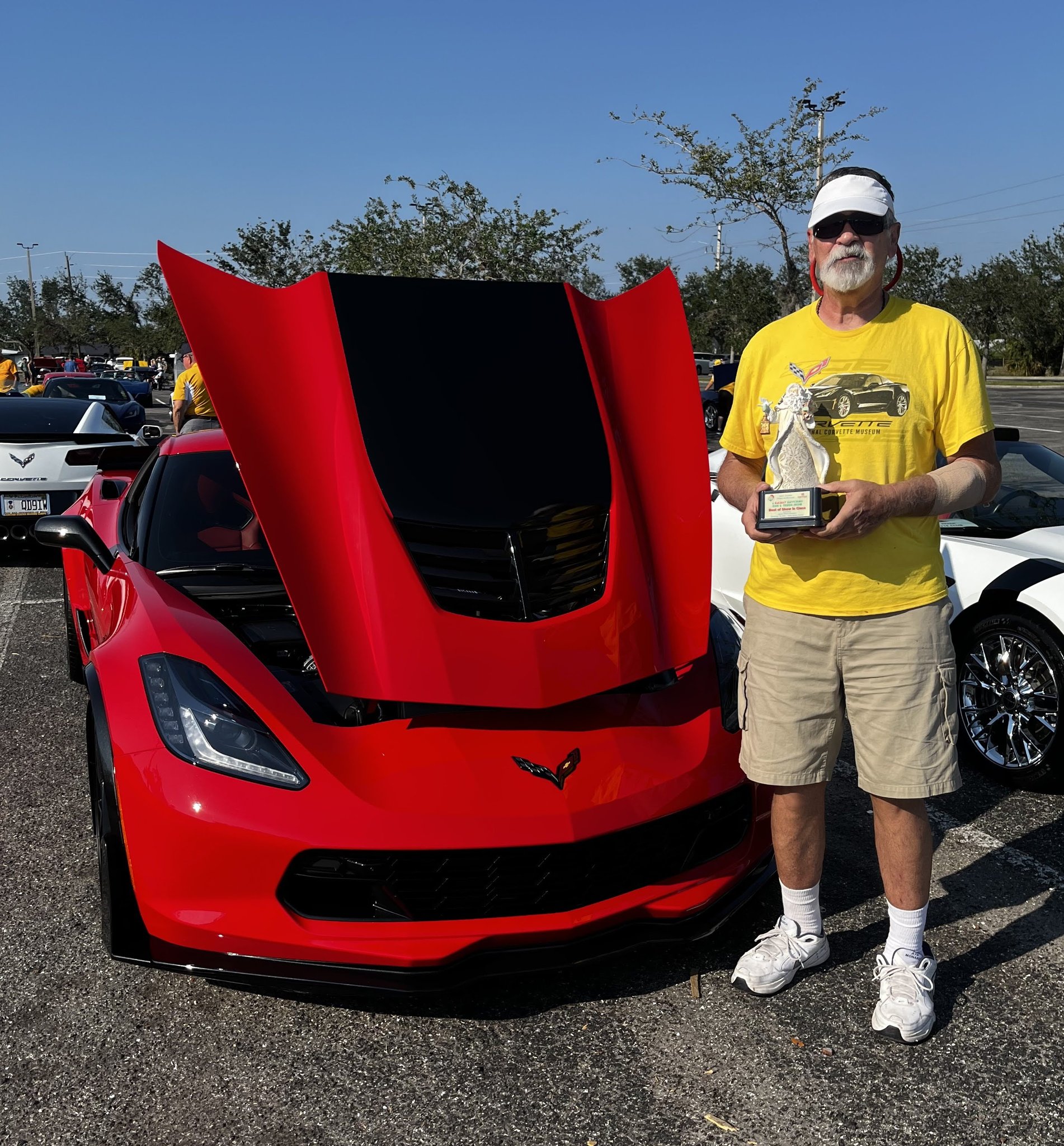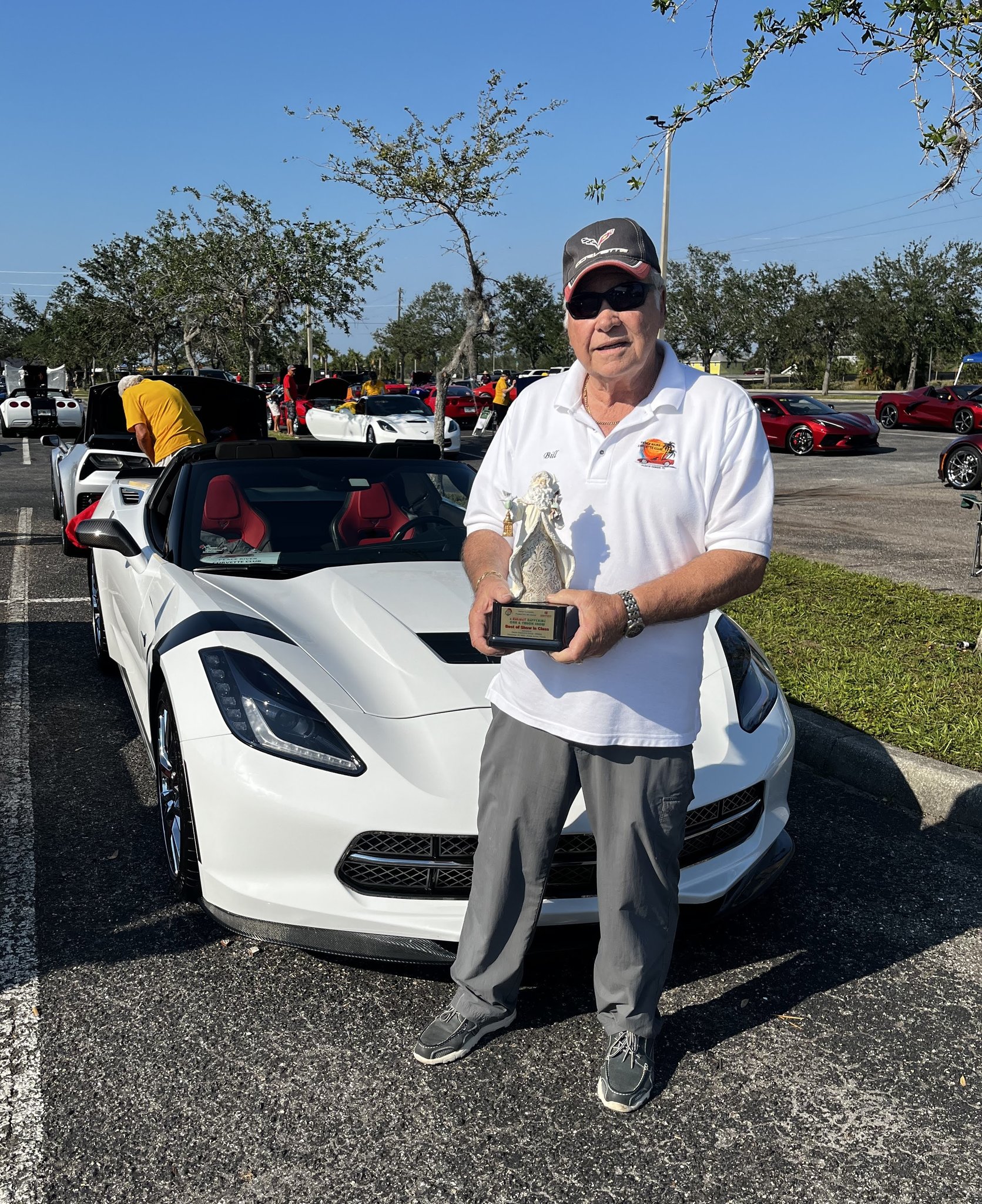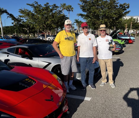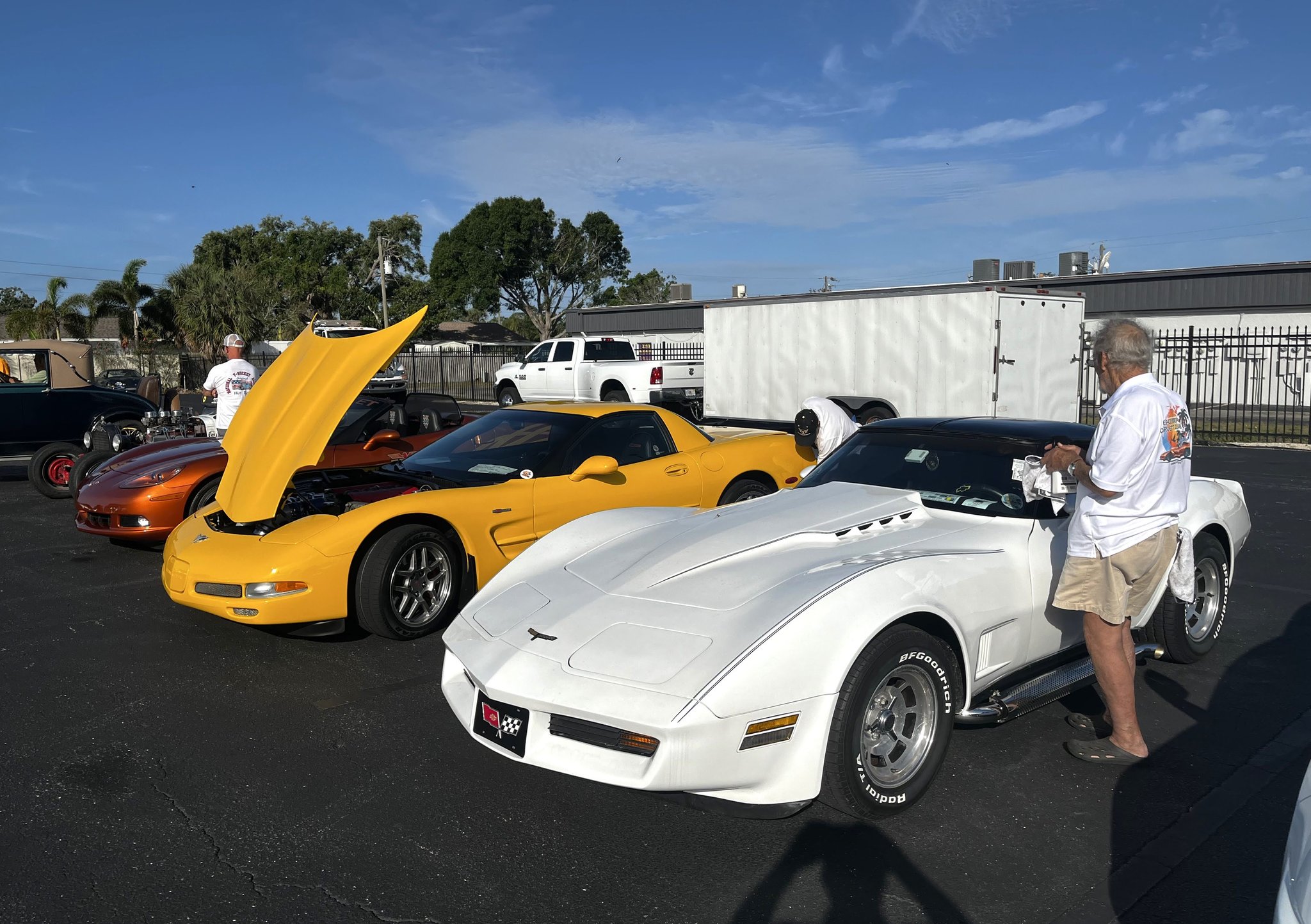 It was a typical HOT Florida morning on that parking lot. Once we completed the final “clean and shine” of our cars, we quickly moved to the shade against the building where there was a little breeze. At the end of the day, two PRCC member’s cars were awarded trophies. Today’s winners were Paul Remillard with his Black Mamba C8 Z06 and John Waiswilos with his beautiful white C3. Congratulations guys!!