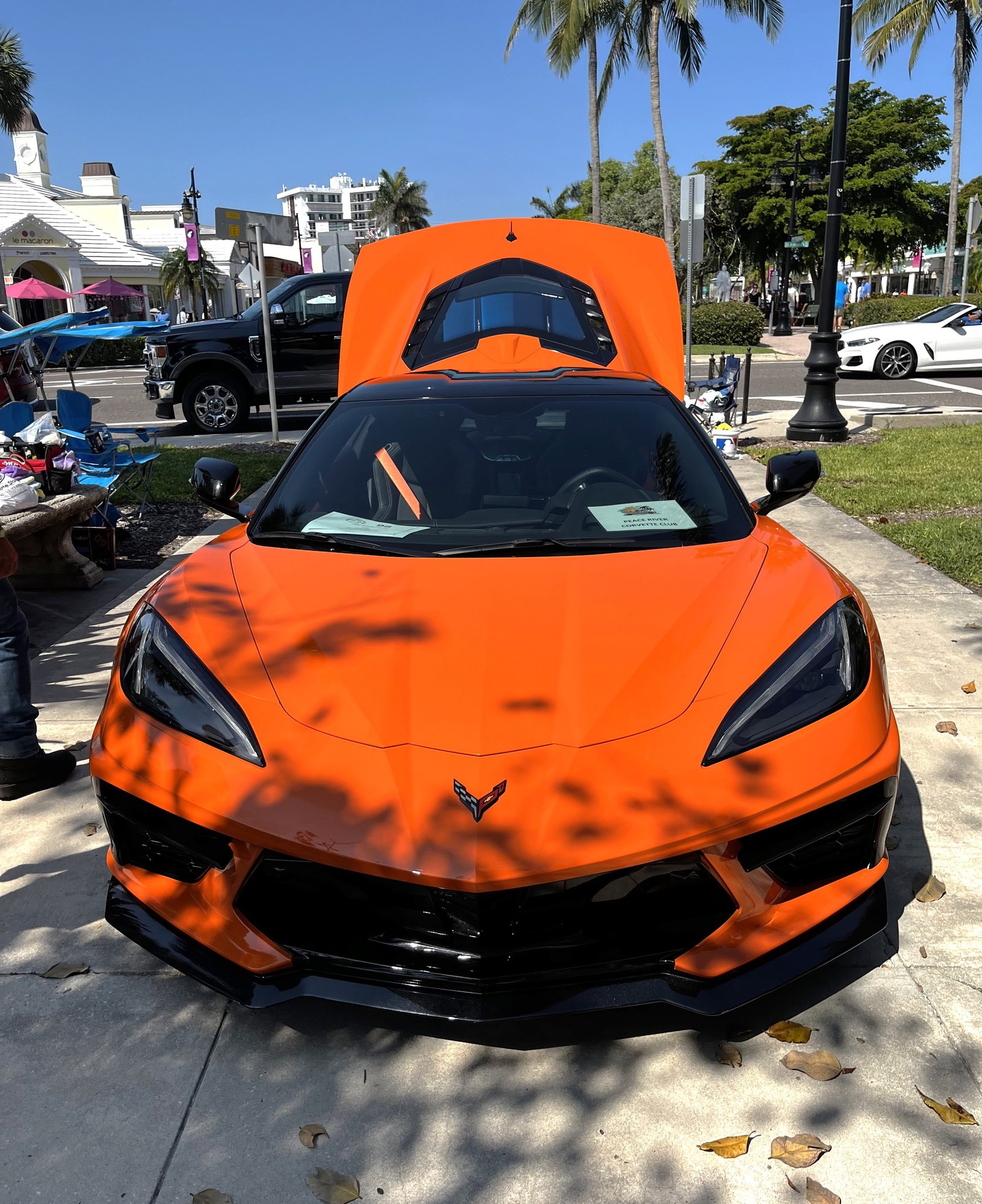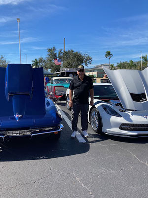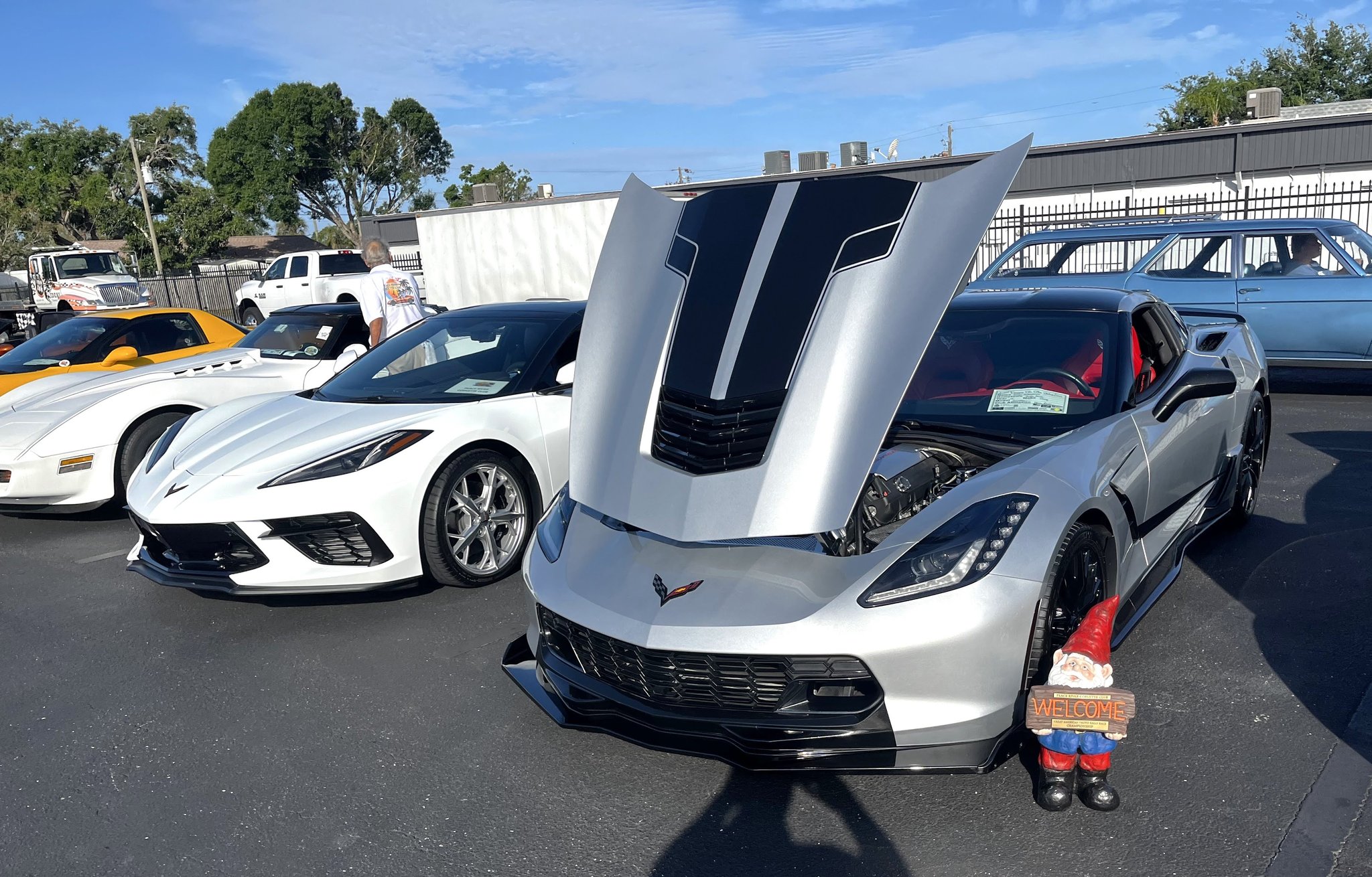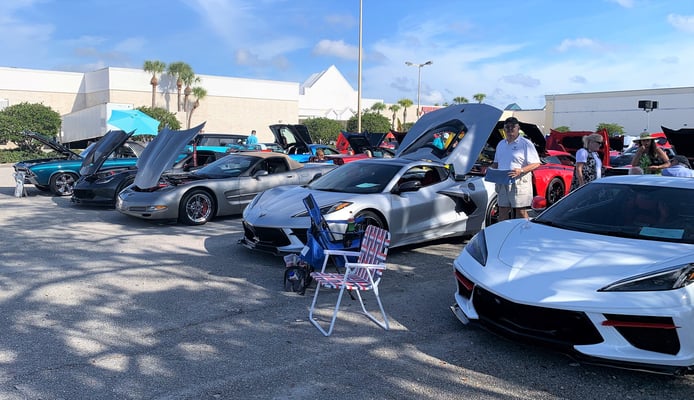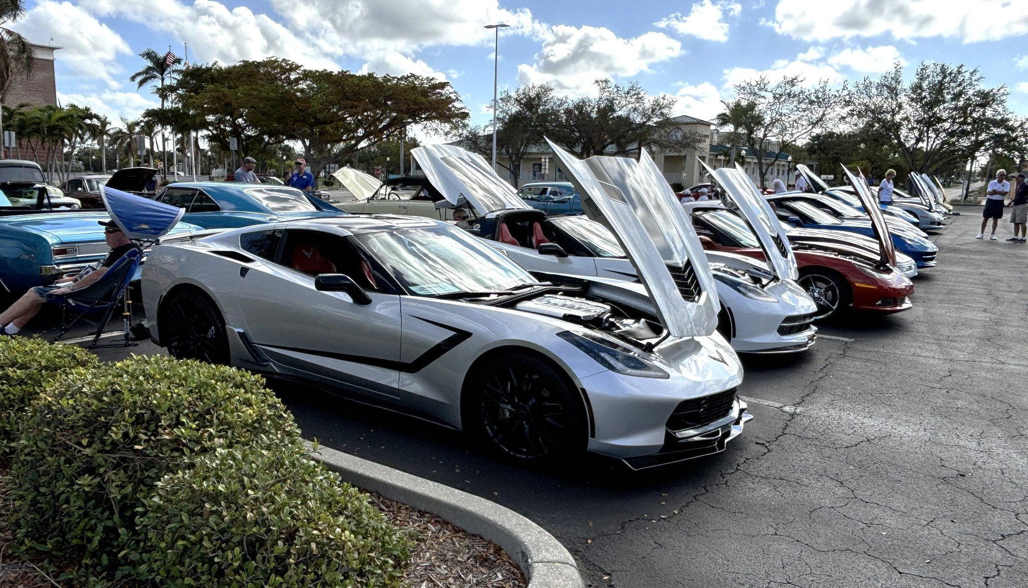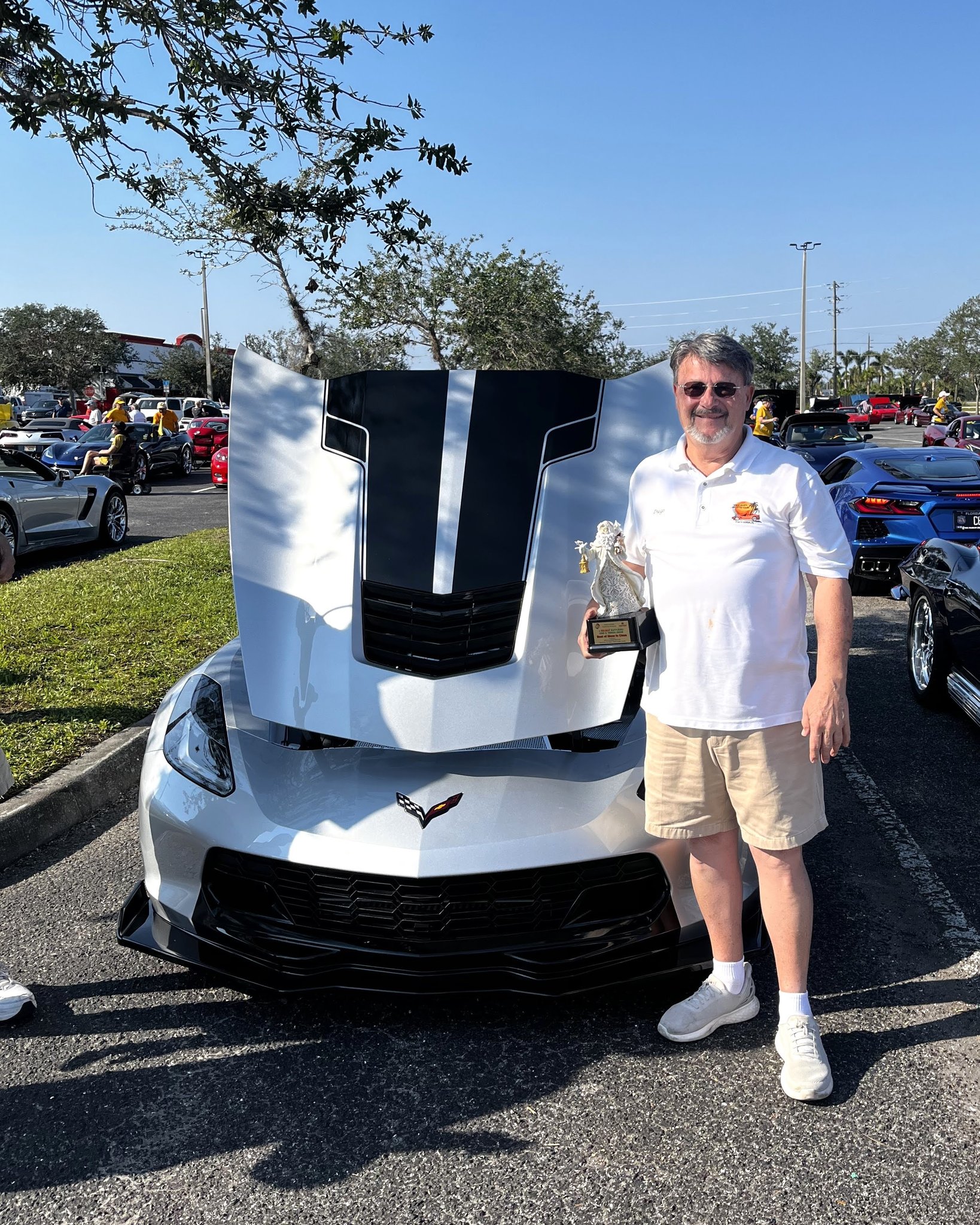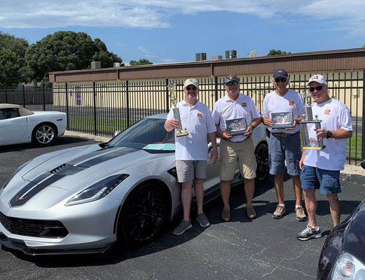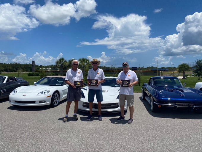 It was a typical HOT Florida morning on that parking lot. Once we completed the final “clean and shine” of our cars, we quickly moved to the shade against the building where there was a little breeze. At the end of the day, two PRCC member’s cars were awarded trophies. Today’s winners were Paul Remillard with his Black Mamba C8 Z06 and John Waiswilos with his beautiful white C3. Congratulations guys!!