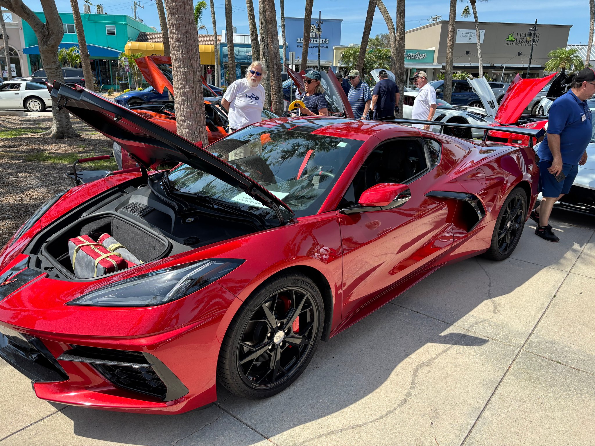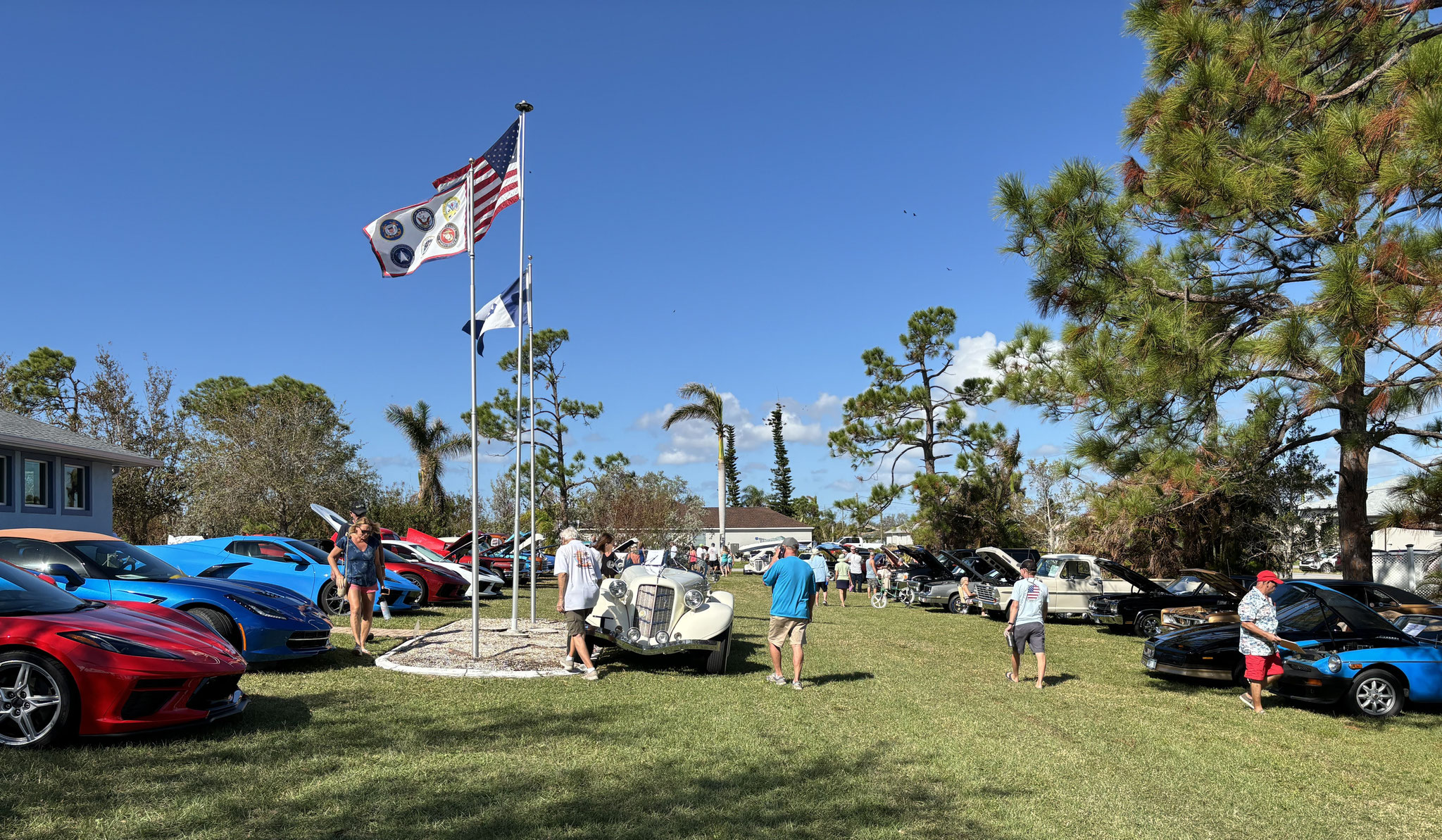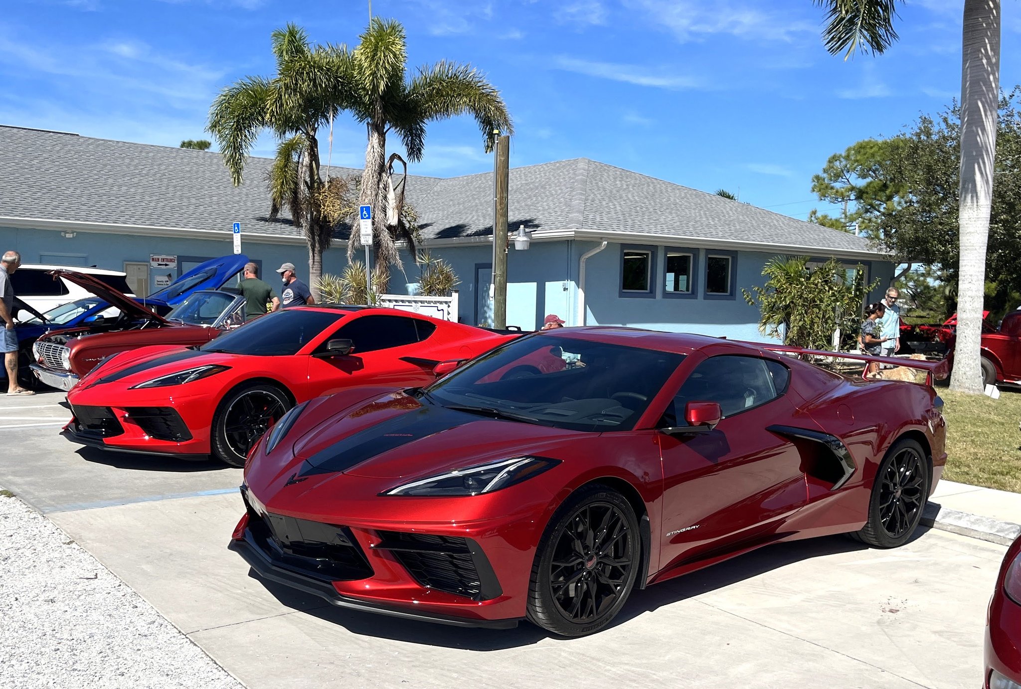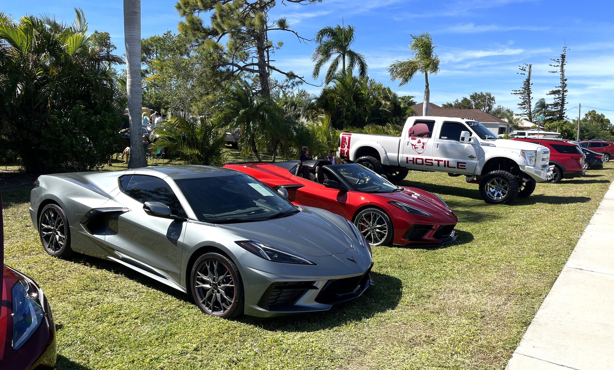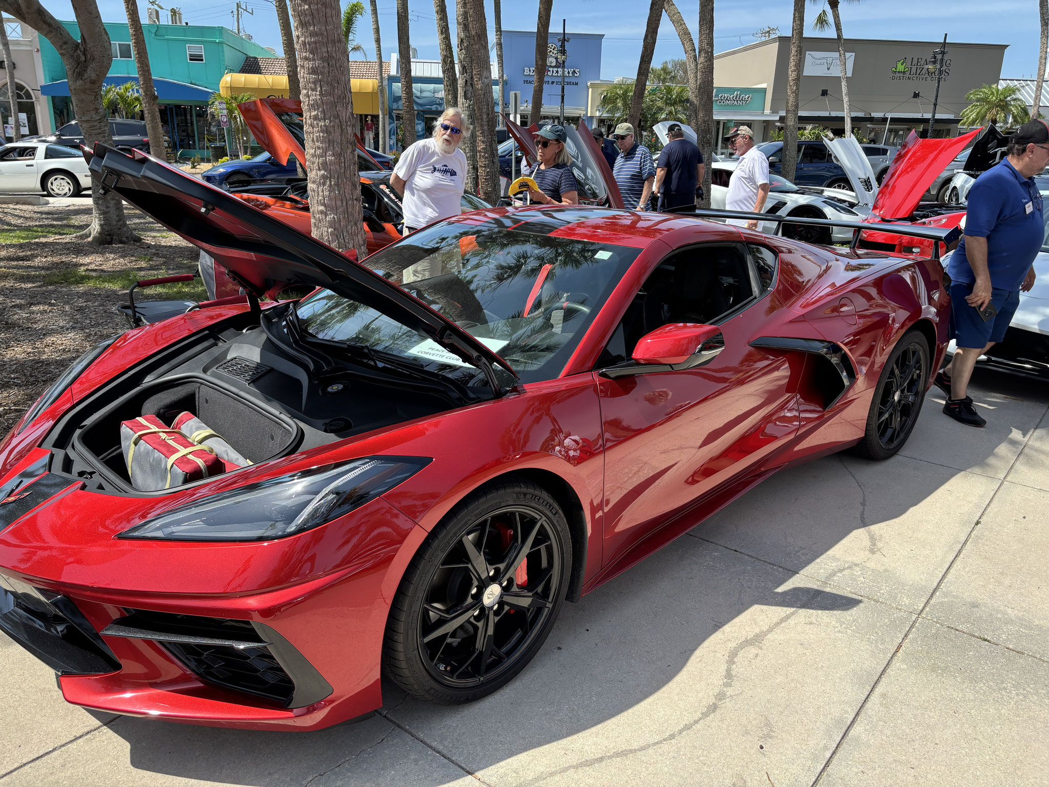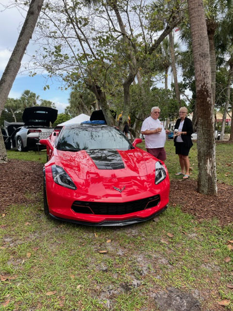 A bunch of us attended the South Gulf Cove Car Show hosted by our own Ed Kerschke and Elaine McNeill. It certainly was a gorgeous day for a car show. Many, many beautiful cars, old and new, which must have been tough for the judges. But… Mark and Gretchen Doran received a trophy for their beautiful 2023 Red Mist C8. Congratulations!!