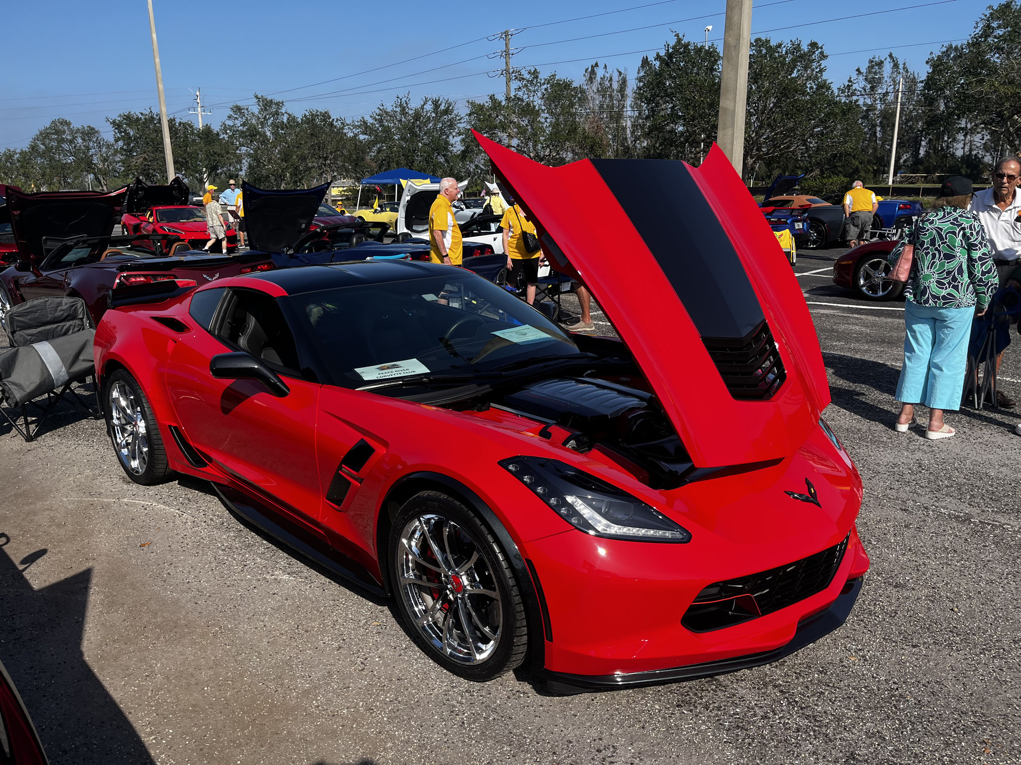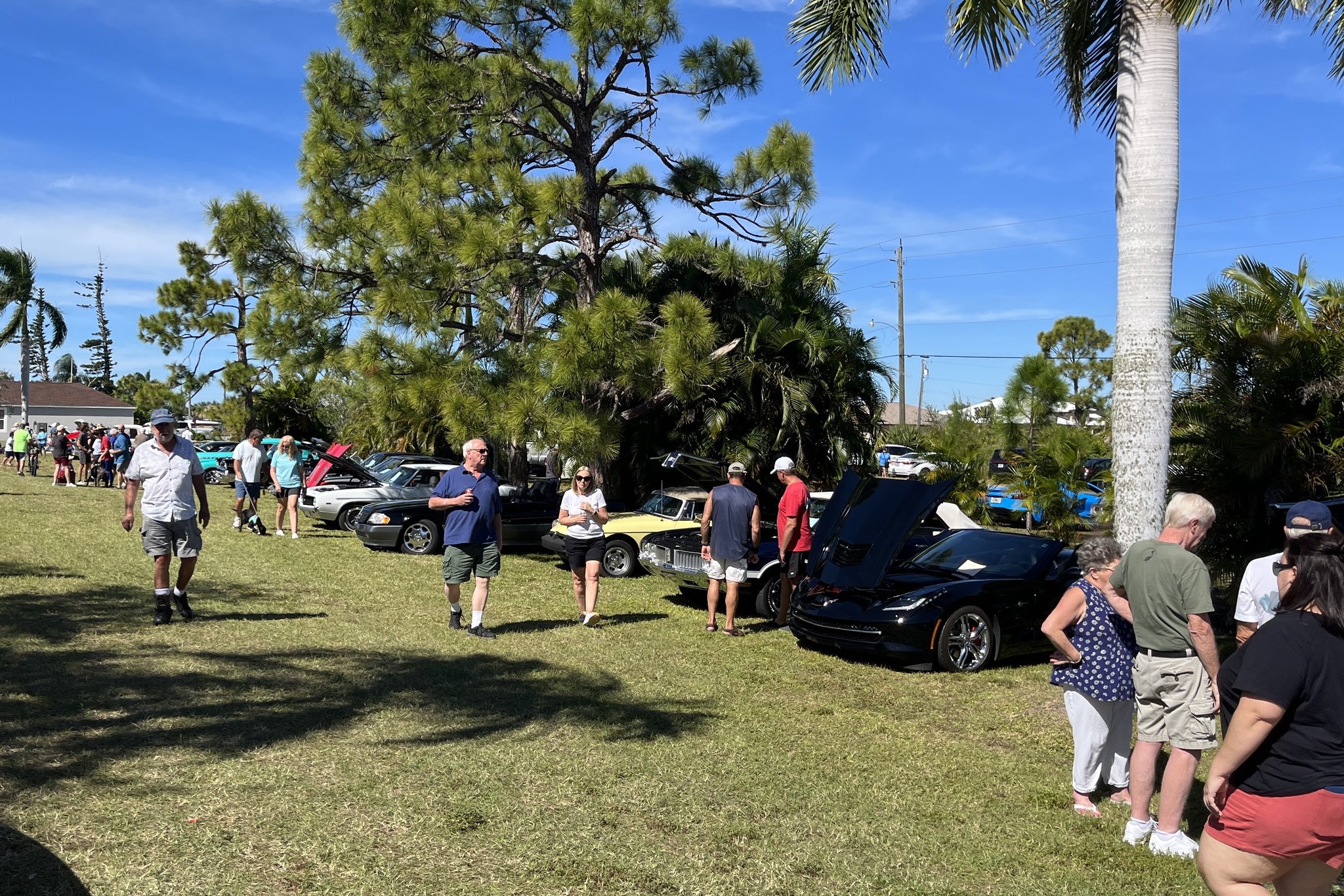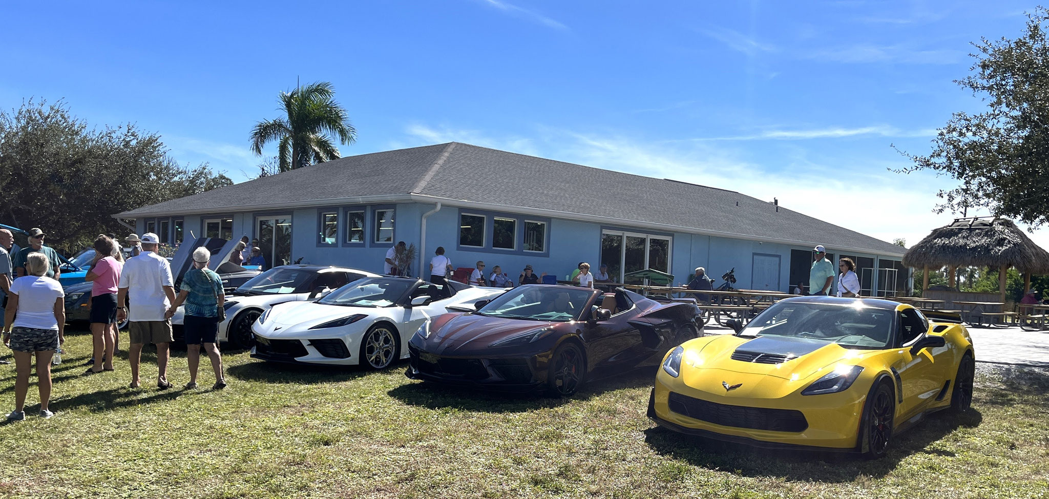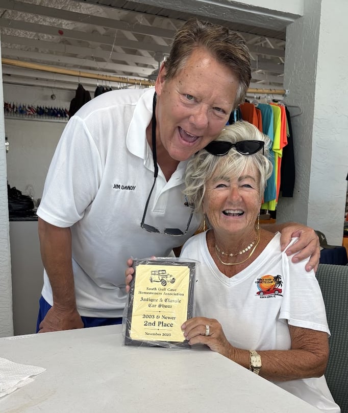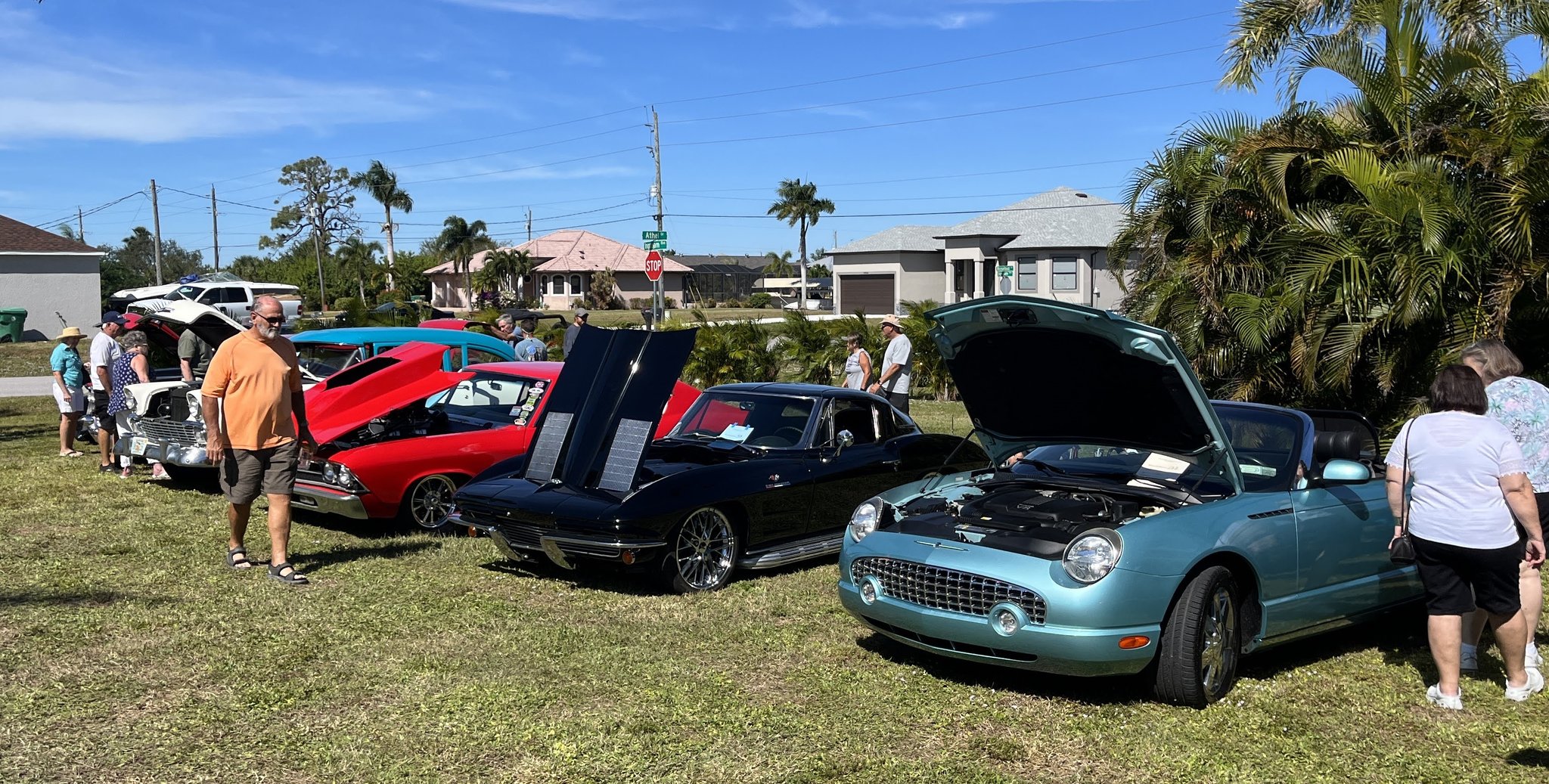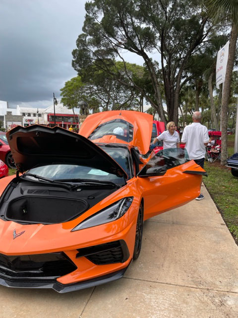 A bunch of us attended the South Gulf Cove Car Show hosted by our own Ed Kerschke and Elaine McNeill. It certainly was a gorgeous day for a car show. Many, many beautiful cars, old and new, which must have been tough for the judges. But… Mark and Gretchen Doran received a trophy for their beautiful 2023 Red Mist C8. Congratulations!!