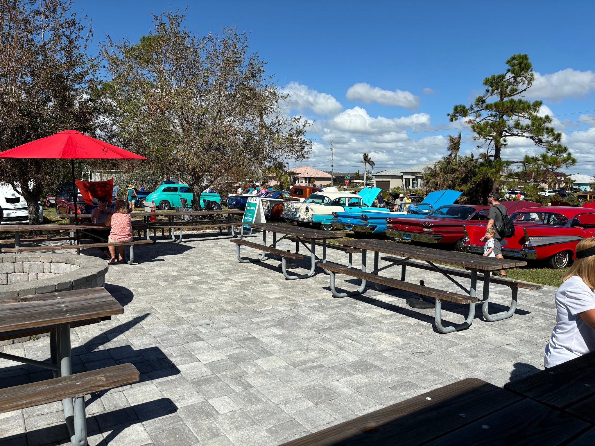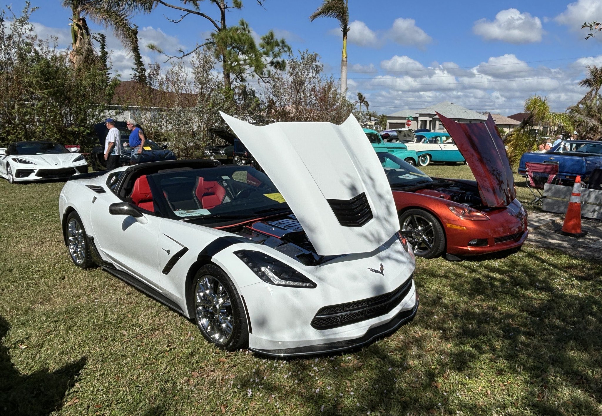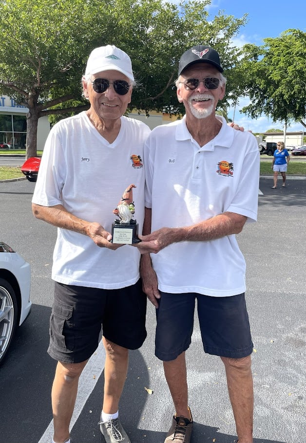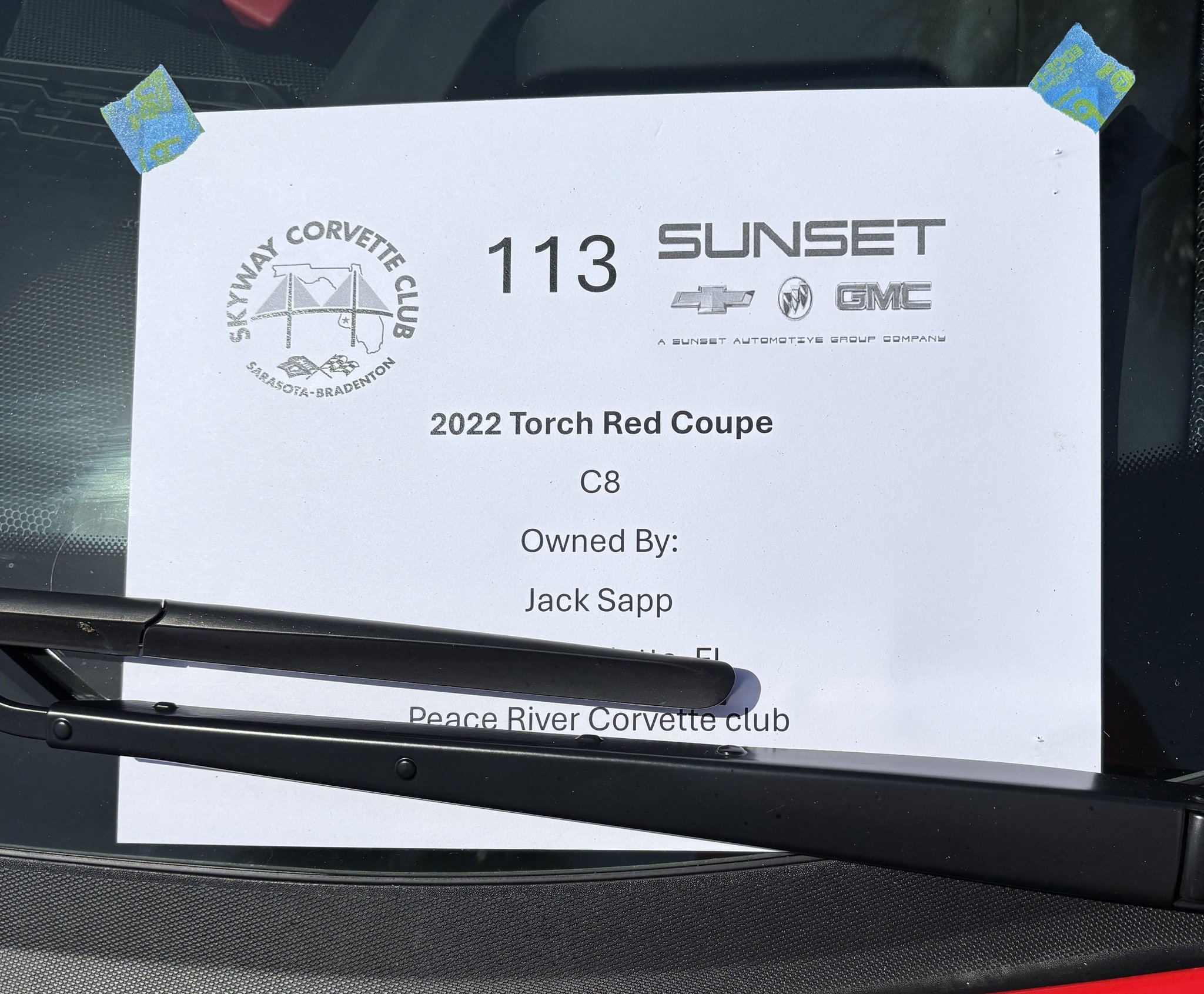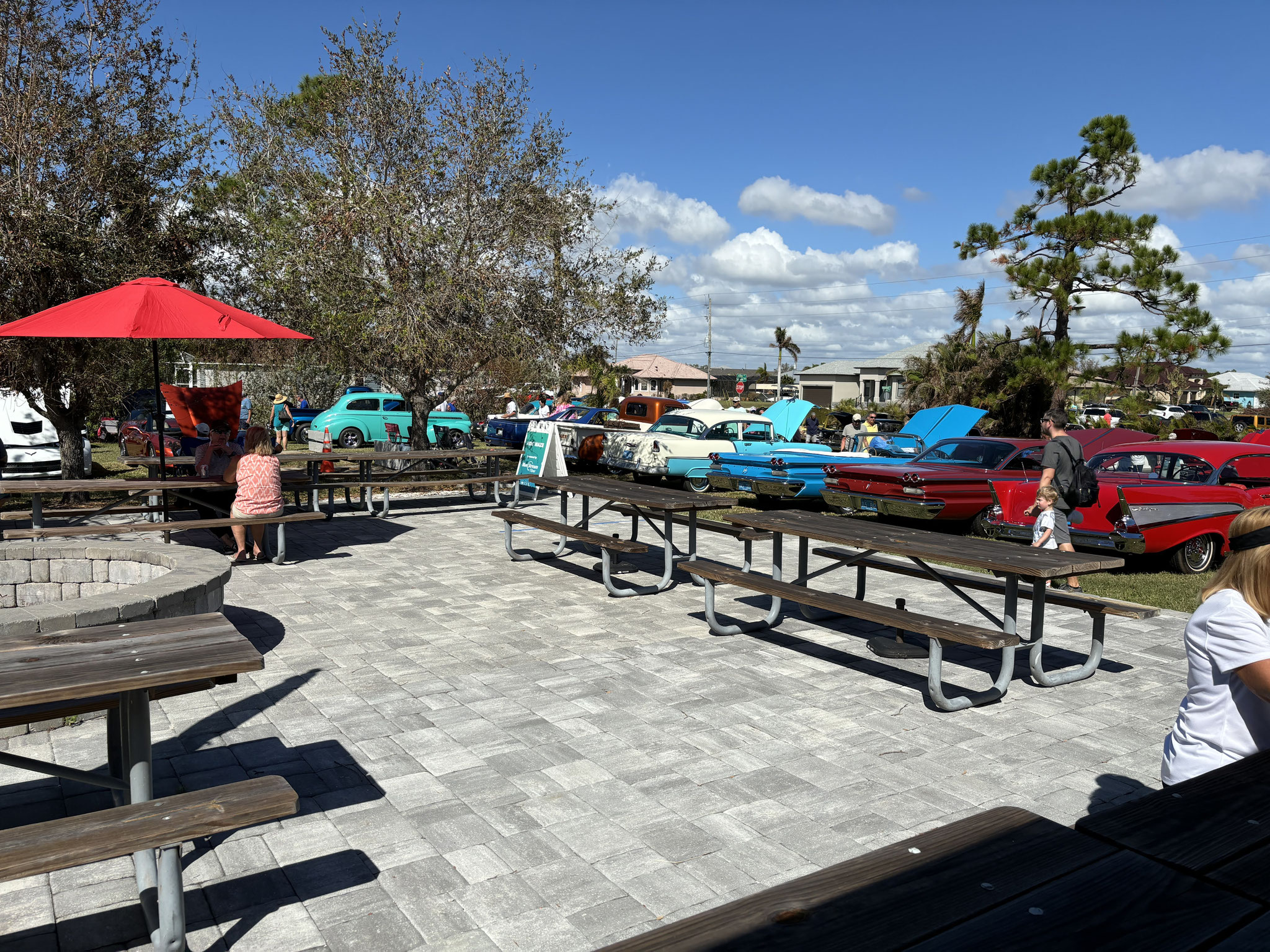 A bunch of us attended the South Gulf Cove Car Show hosted by our own Ed Kerschke and Elaine McNeill. It certainly was a gorgeous day for a car show. Many, many beautiful cars, old and new, which must have been tough for the judges. But… Mark and Gretchen Doran received a trophy for their beautiful 2023 Red Mist C8. Congratulations!!