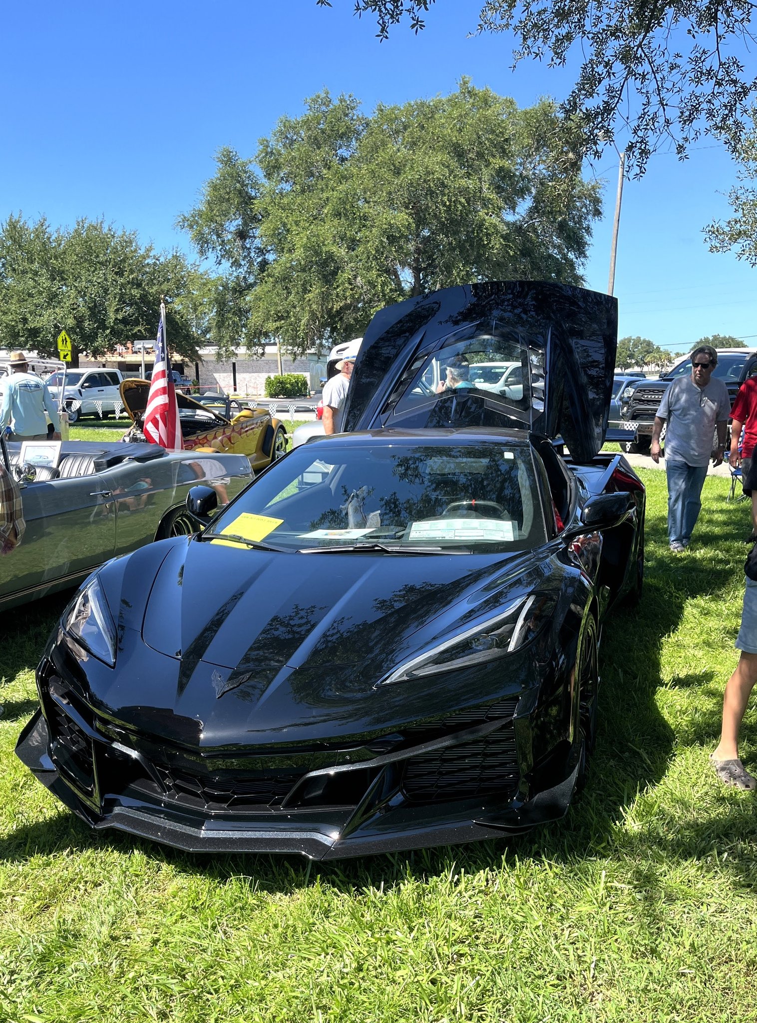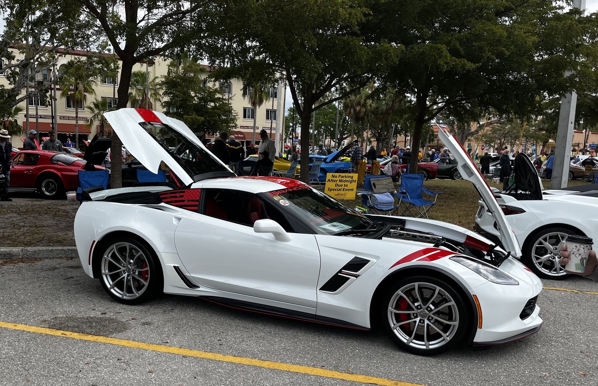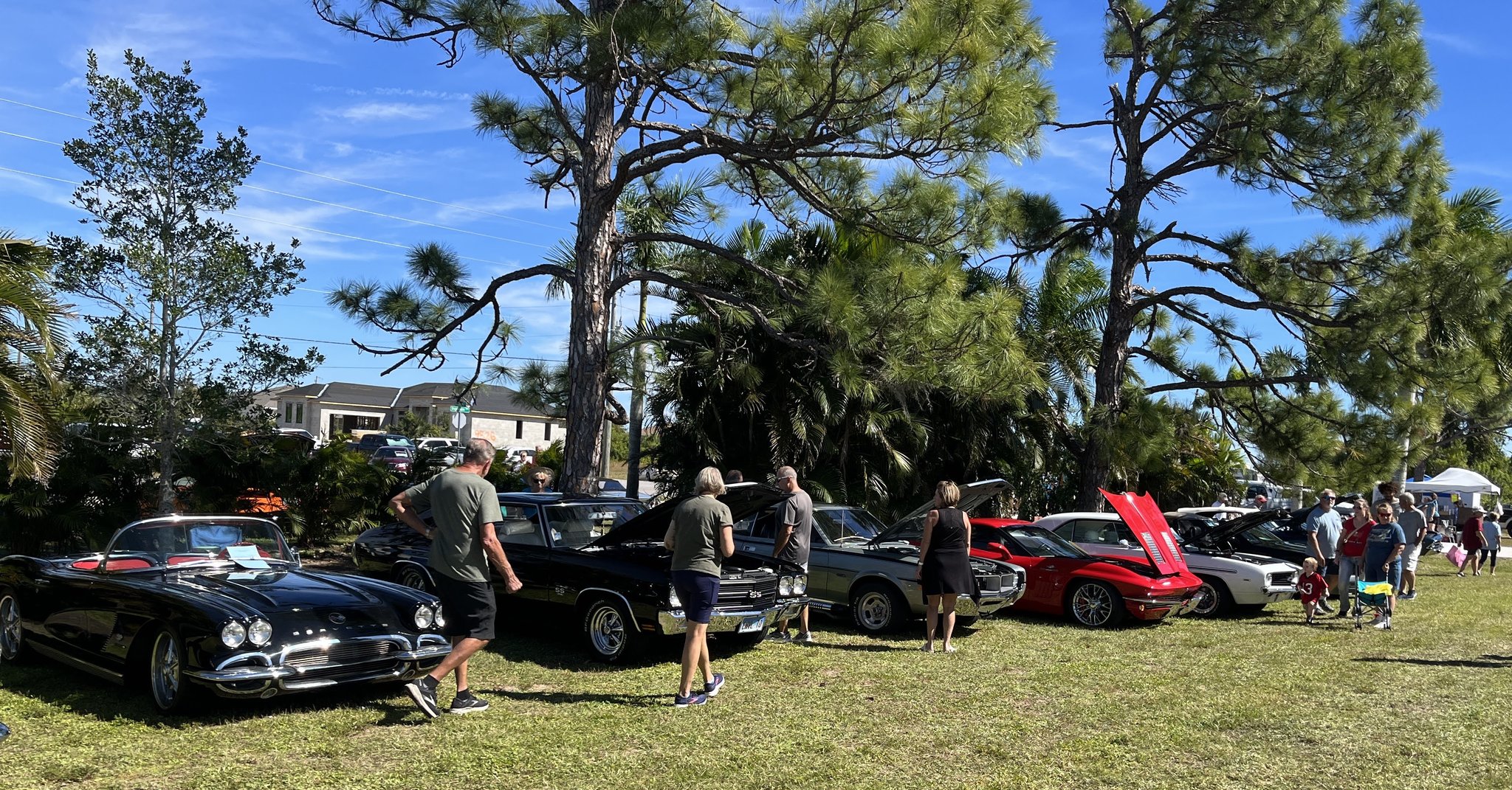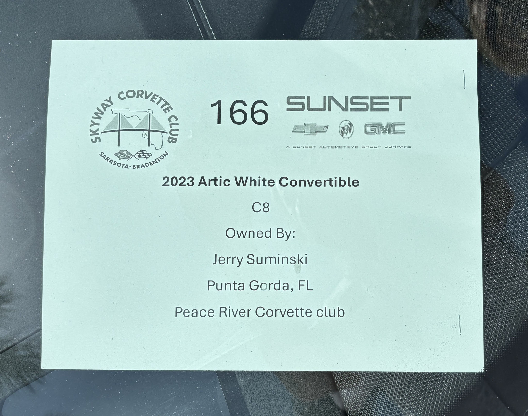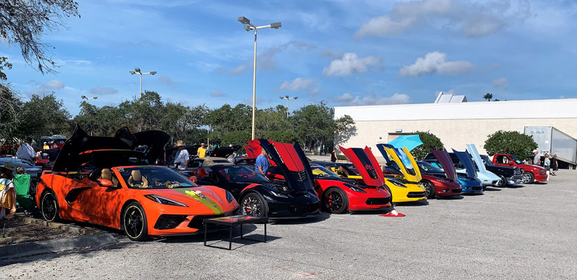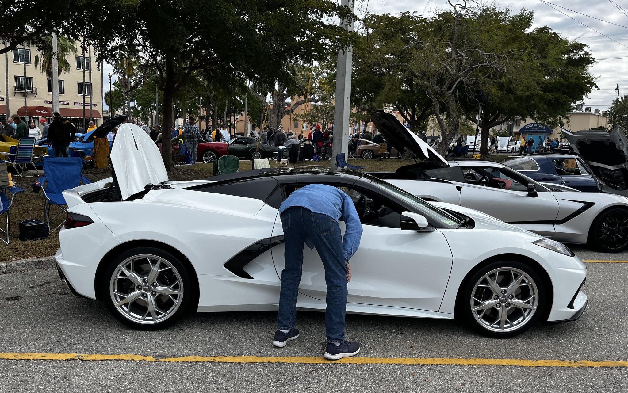 A bunch of us attended the South Gulf Cove Car Show hosted by our own Ed Kerschke and Elaine McNeill. It certainly was a gorgeous day for a car show. Many, many beautiful cars, old and new, which must have been tough for the judges. But… Mark and Gretchen Doran received a trophy for their beautiful 2023 Red Mist C8. Congratulations!!