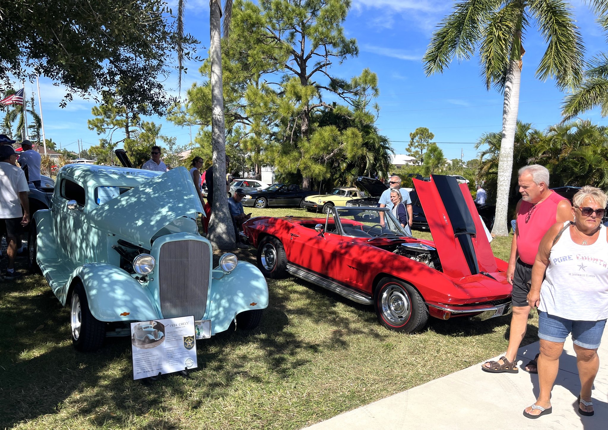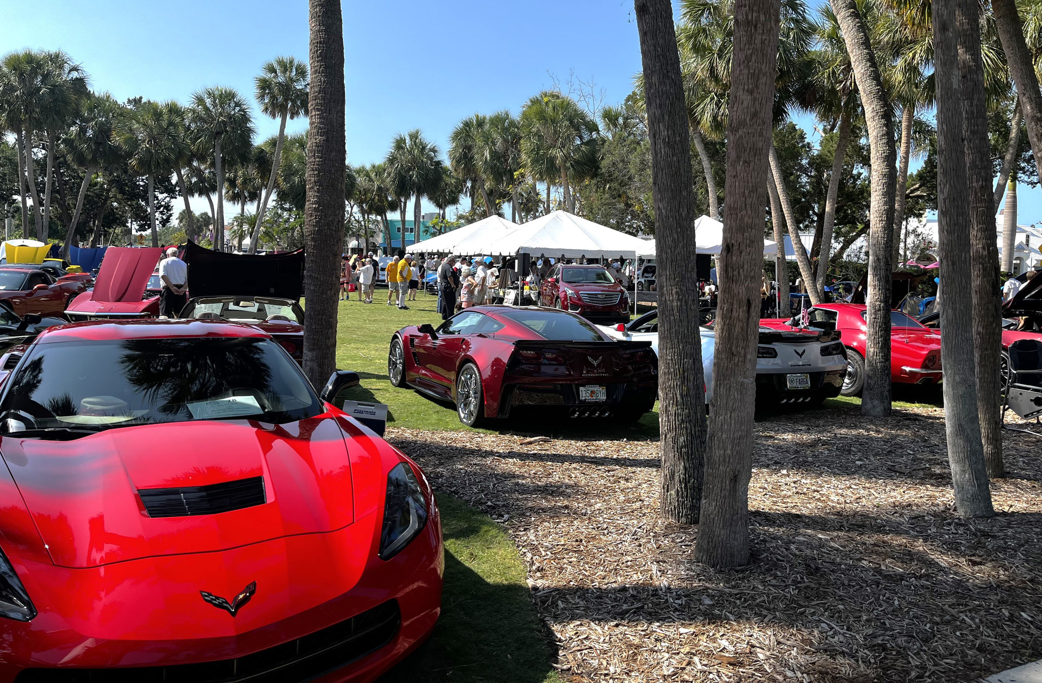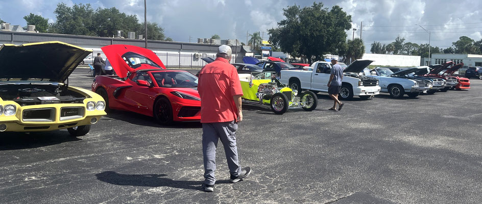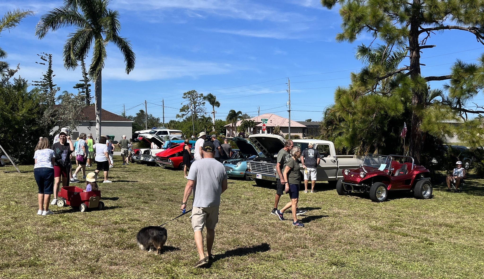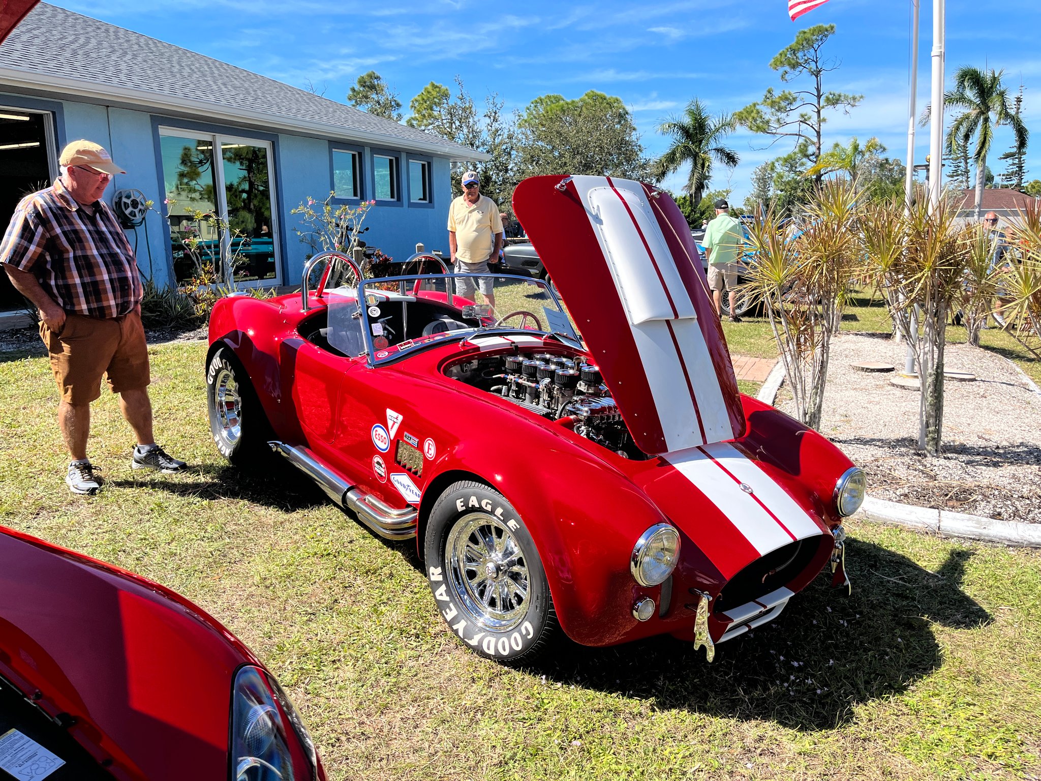 A bunch of us attended the South Gulf Cove Car Show hosted by our own Ed Kerschke and Elaine McNeill. It certainly was a gorgeous day for a car show. Many, many beautiful cars, old and new, which must have been tough for the judges. But… Mark and Gretchen Doran received a trophy for their beautiful 2023 Red Mist C8. Congratulations!!