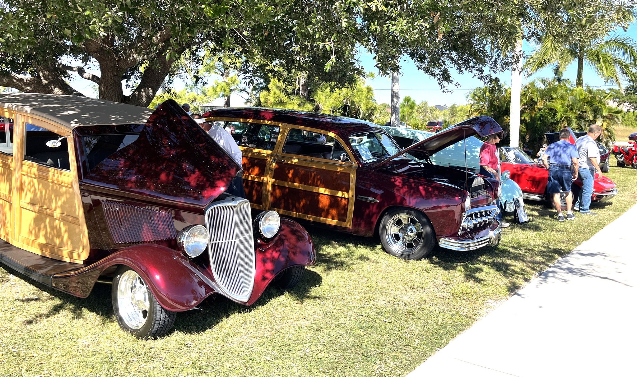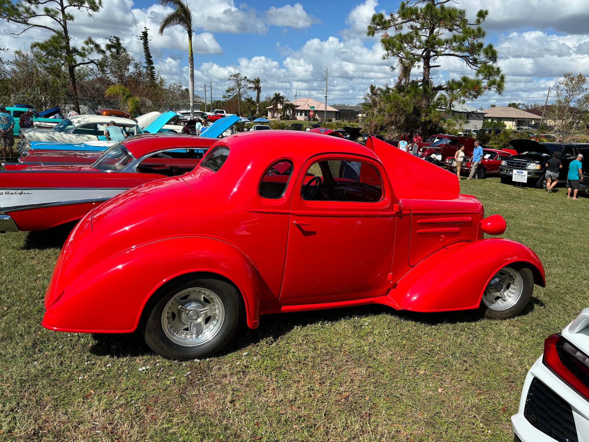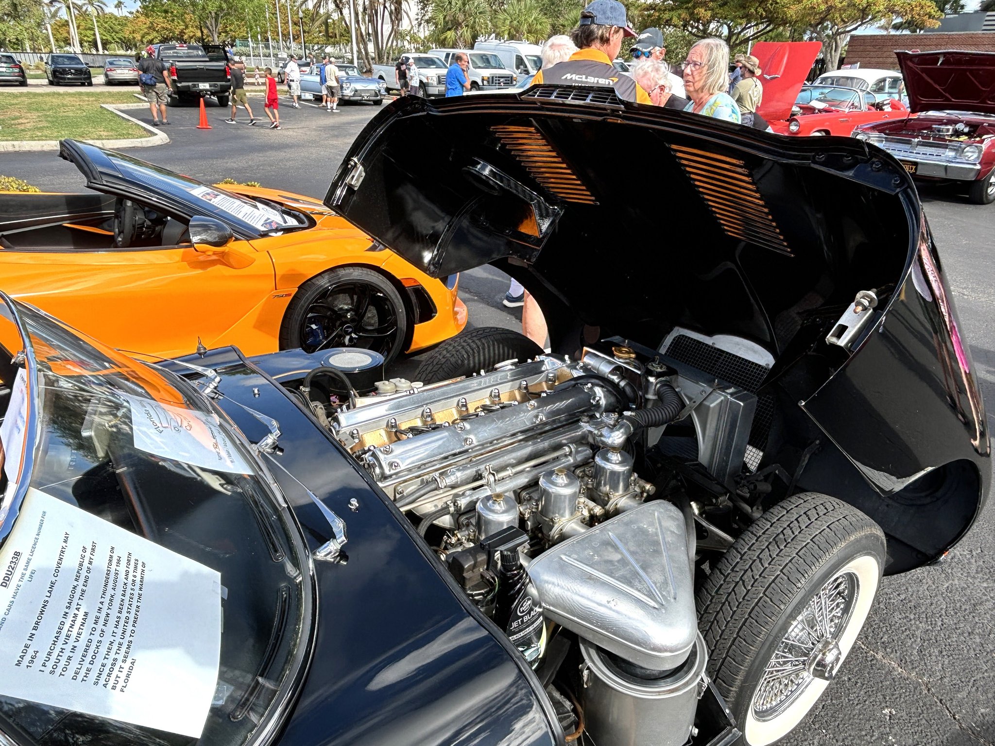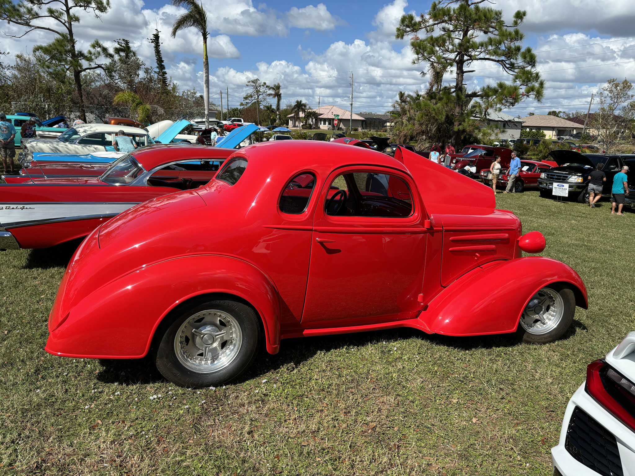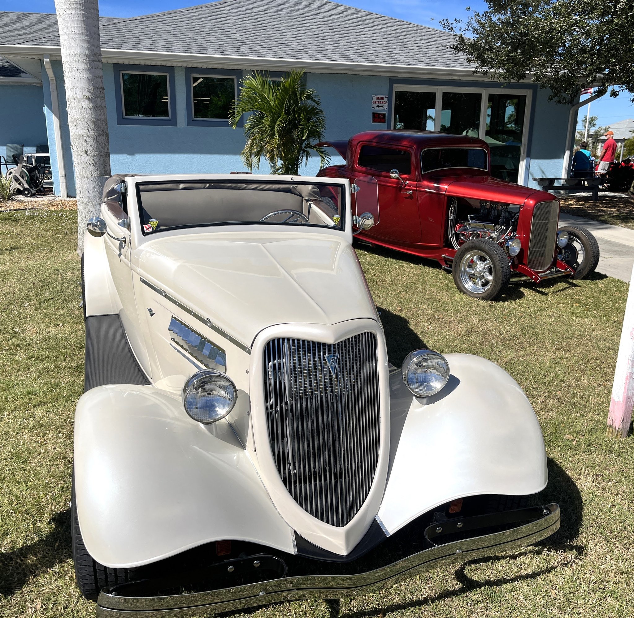 A bunch of us attended the South Gulf Cove Car Show hosted by our own Ed Kerschke and Elaine McNeill. It certainly was a gorgeous day for a car show. Many, many beautiful cars, old and new, which must have been tough for the judges. But… Mark and Gretchen Doran received a trophy for their beautiful 2023 Red Mist C8. Congratulations!!