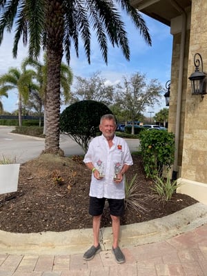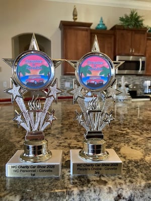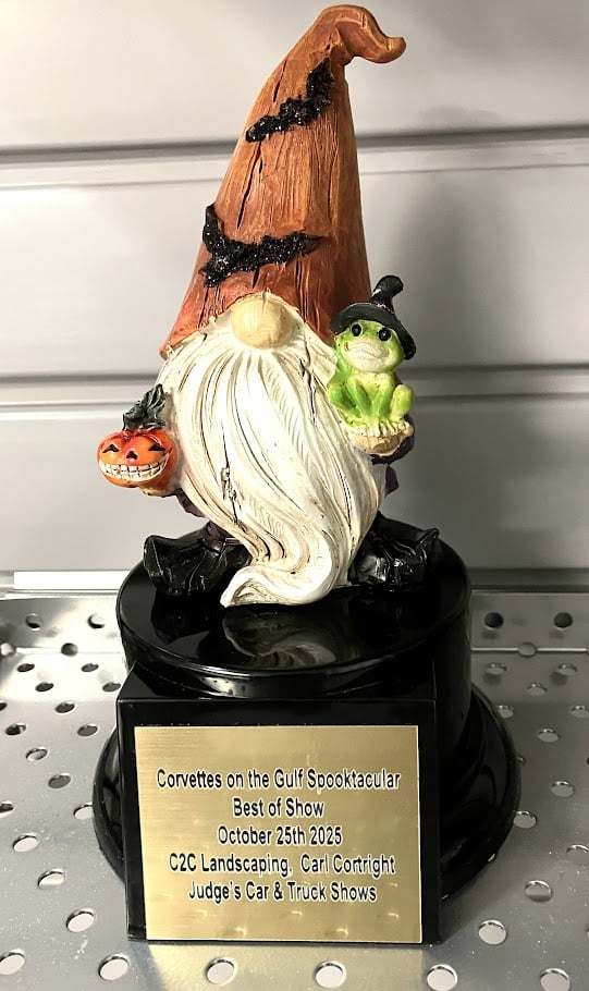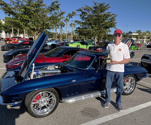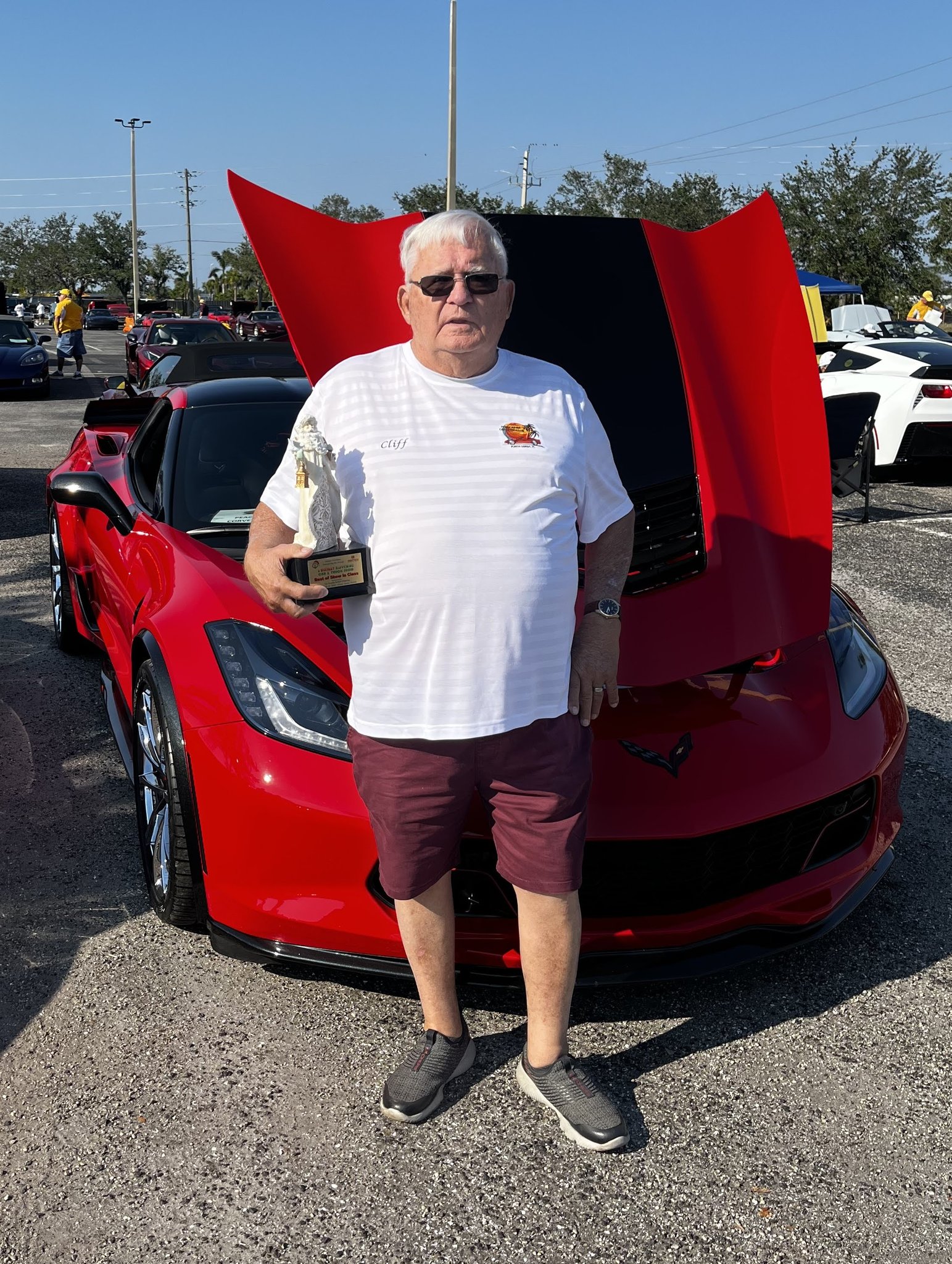 On Sunday, Brother Wally & Jeri Schmaltz, and I attended the car show hosted by the Corvettes in Paradise Corvette Club in Naples, Florida. Brother Wally won two trophies with his beautiful Red Mist, C8 convertible. The weather was great and the host club was very cordial and appreciated us attending the show. Check out the photos below oof Wally and his trophies. Congratulations Wally.