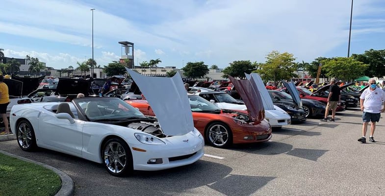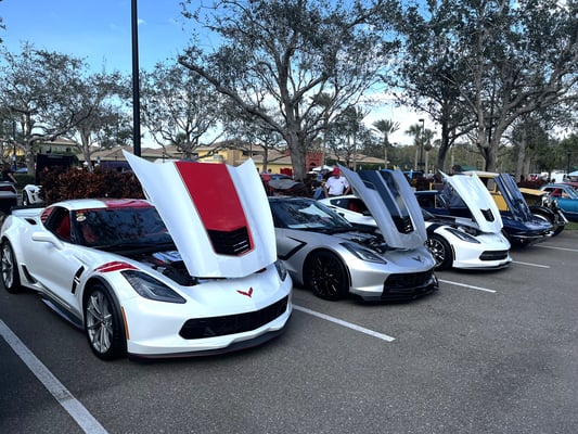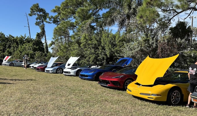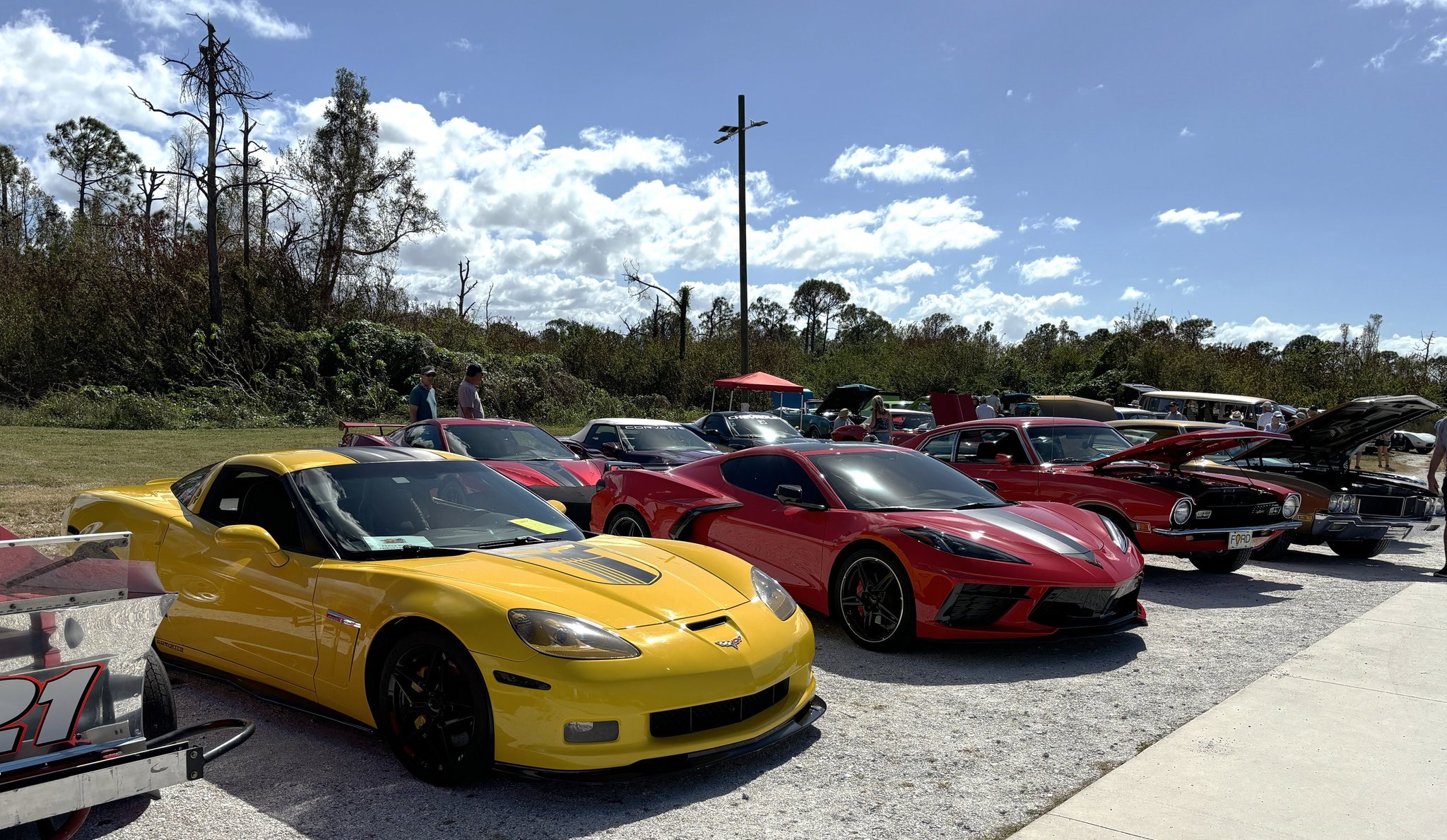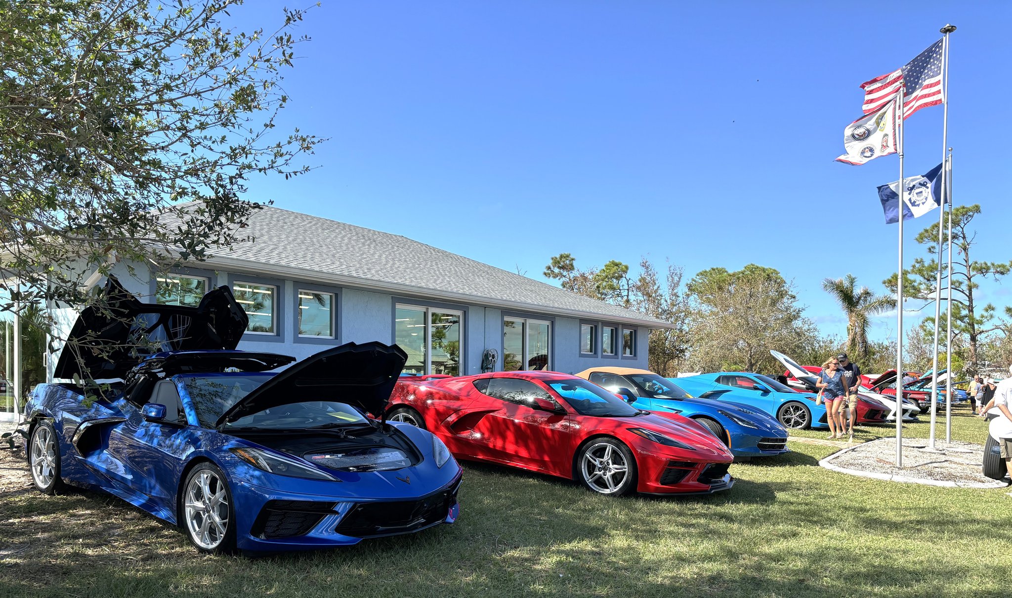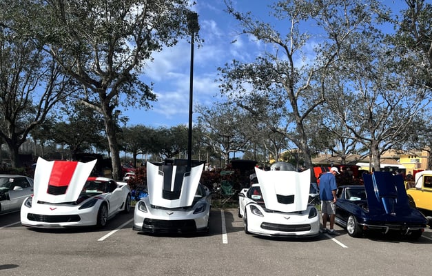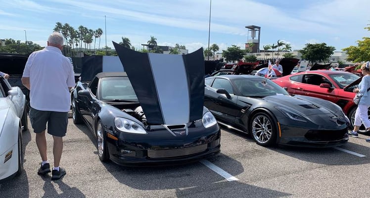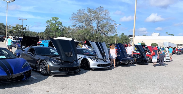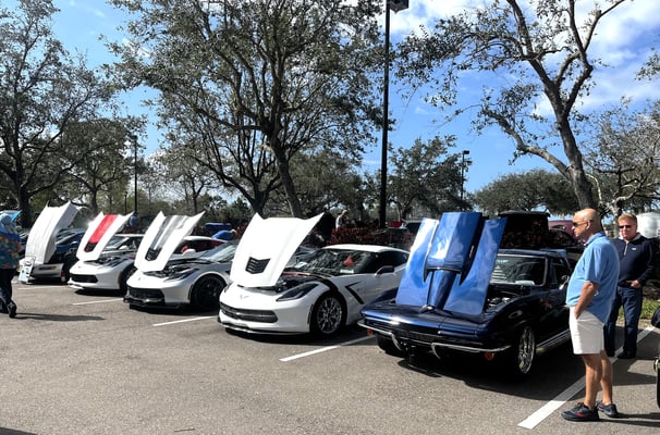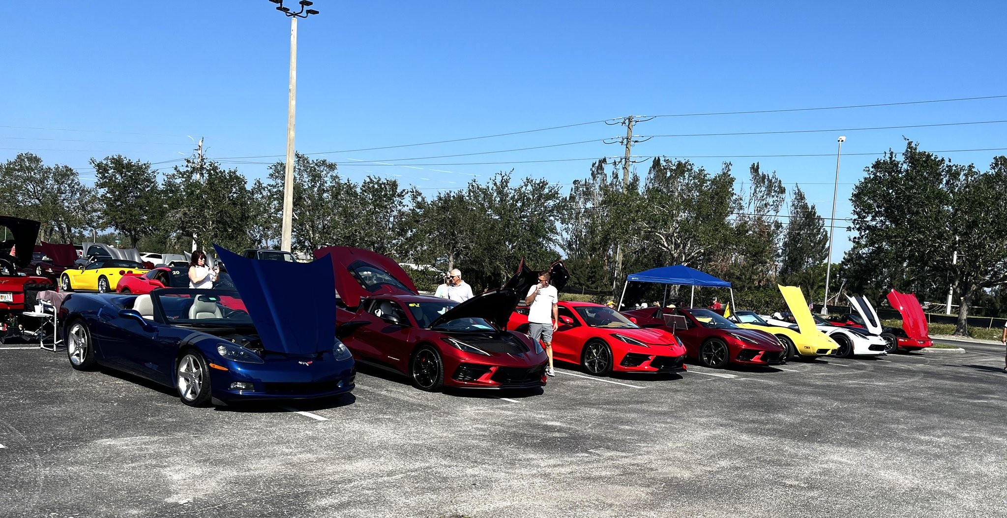 Our PRCC Corvettes caravaned to the South Gulf Cove HOA pavilion where we had 14 cars in the show. Congratulations to Jim and Mary for their blue C8 convertible that took second place in the new car category!