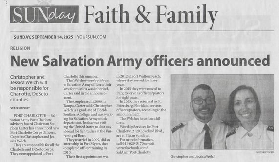 PRCC welcomes the new Salvation Army Captain - Chris Welch, his wife, and their four children to the Port Charlotte location. We wish the best to the former Captain Israel Roseno and his wife Claudia, on their new promotion as Majors and relocation to Atlanta, Georgia.